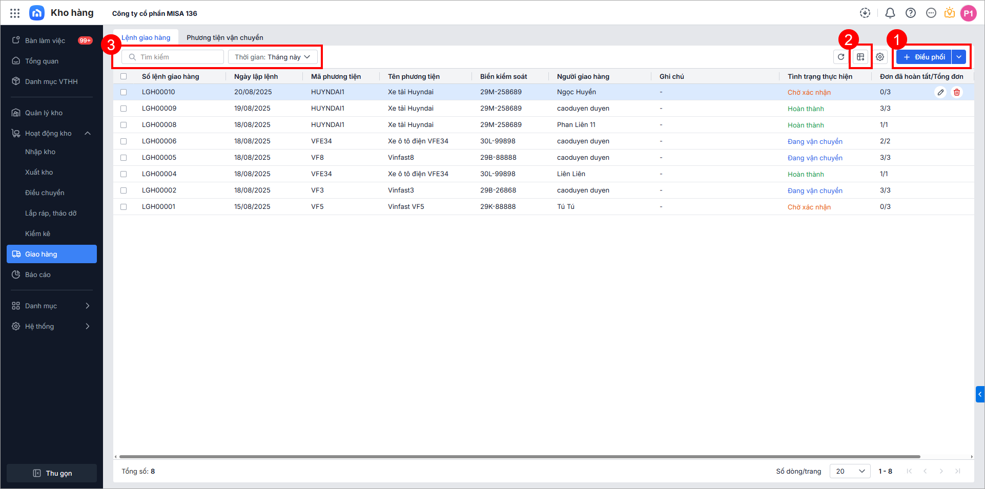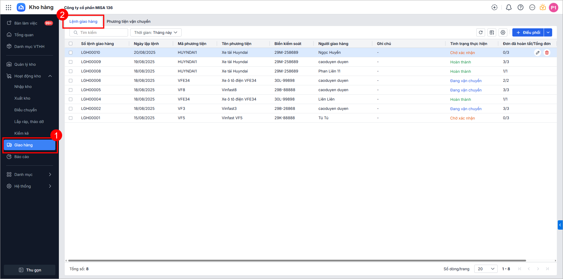 Vào phân hệ Giao hàng, tab Lệnh giao hàng hiển thị danh sách các Lệnh giao hàng đã tạo.