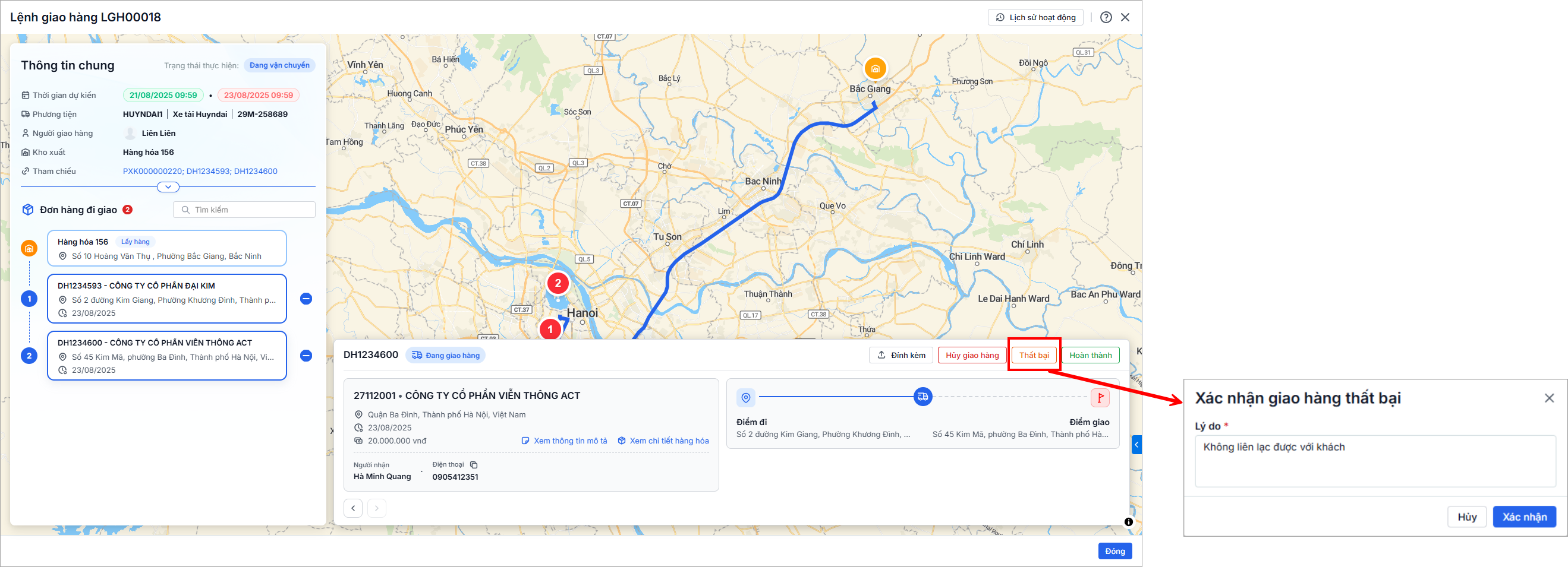 - Thất bại (áp dụng với đơn đặt hàng có trạng thái là Đang giao hàng, Giao lại lần <x>)