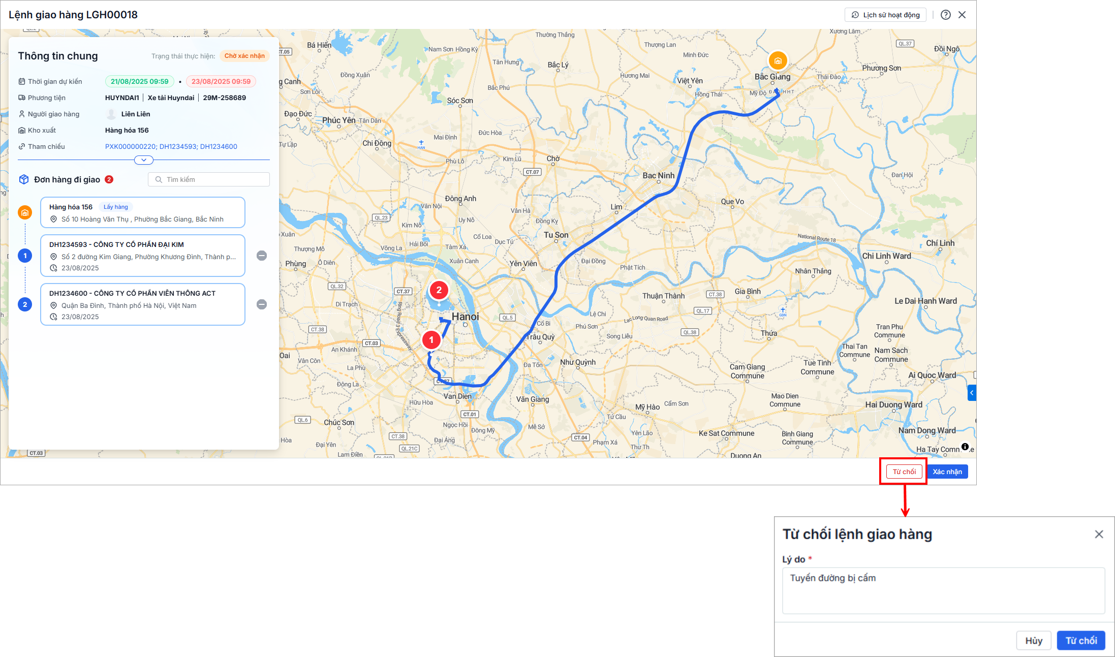 Nhấn vào 1 dòng Lệnh giao hàng để xem chi tiết và thực hiện các chức năng theo từng vai trò.