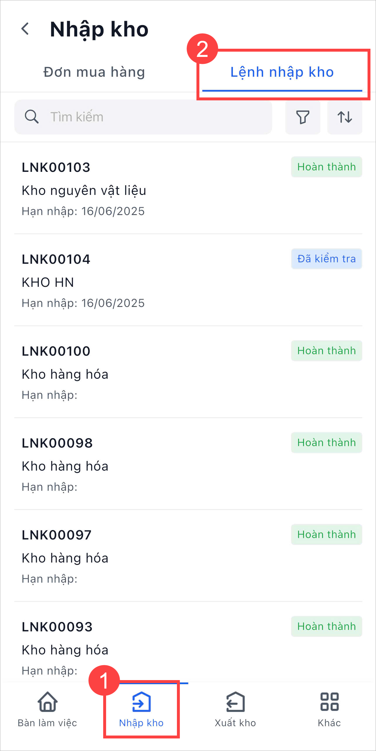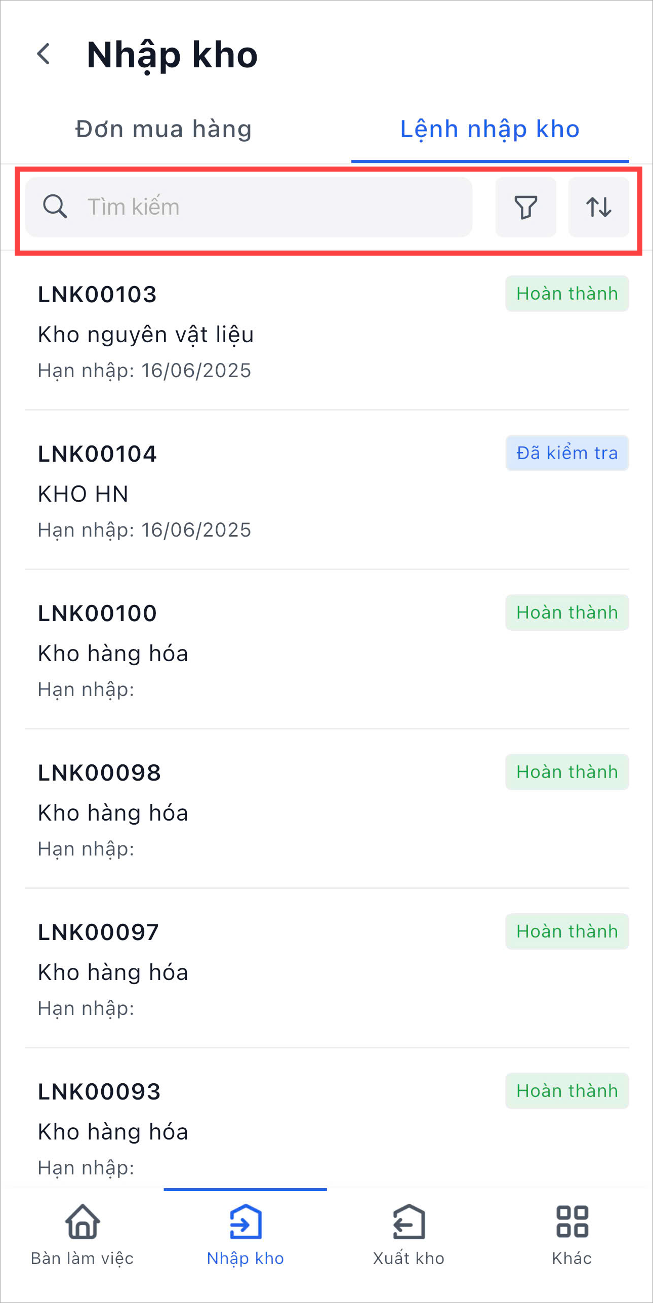 Anh/Chị có thể tìm kiếm, sắp xếp hiển thị, lọc theo Tình trạng thực hiện, Kho nhập, Hạn nhập kho.