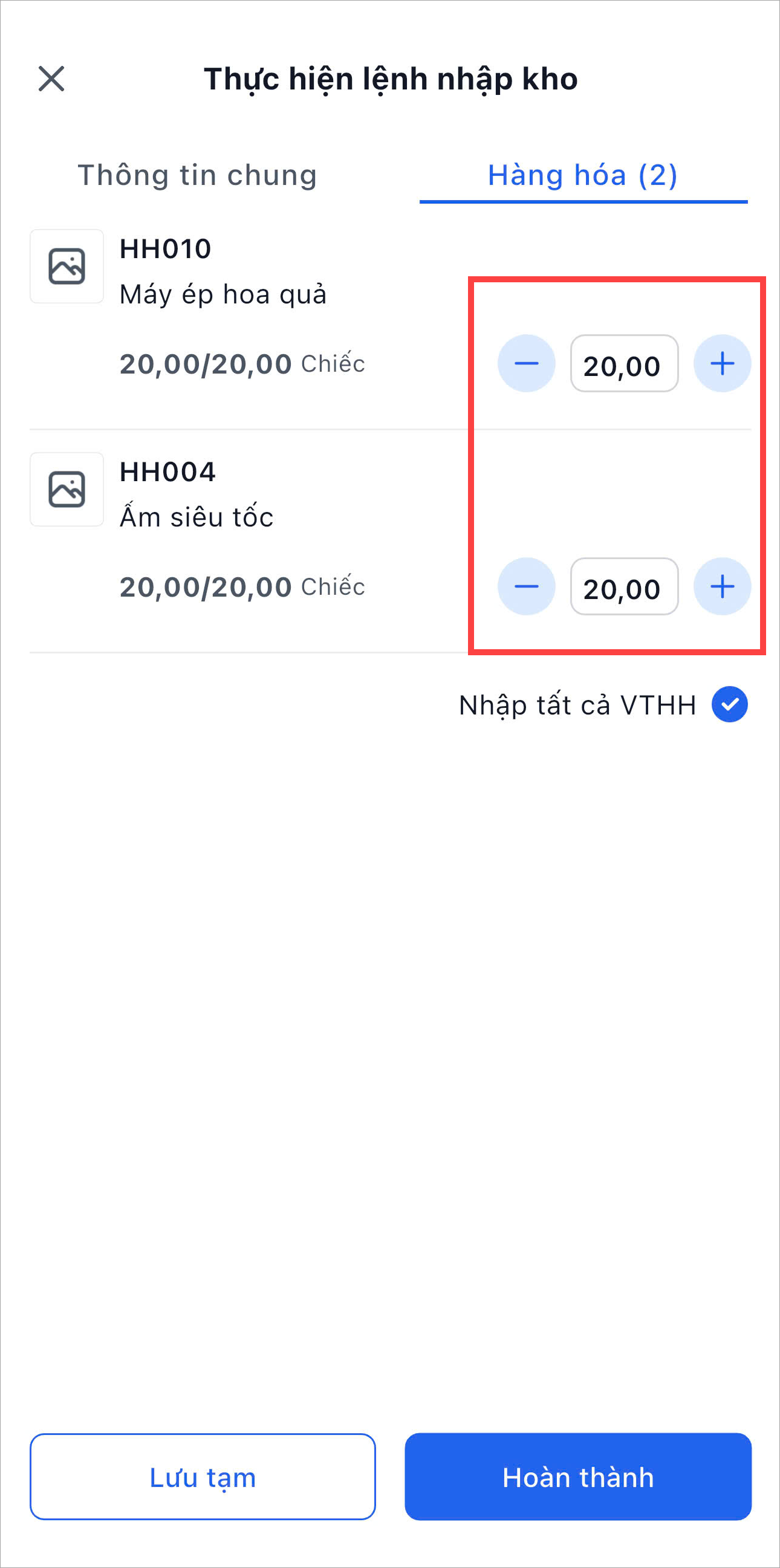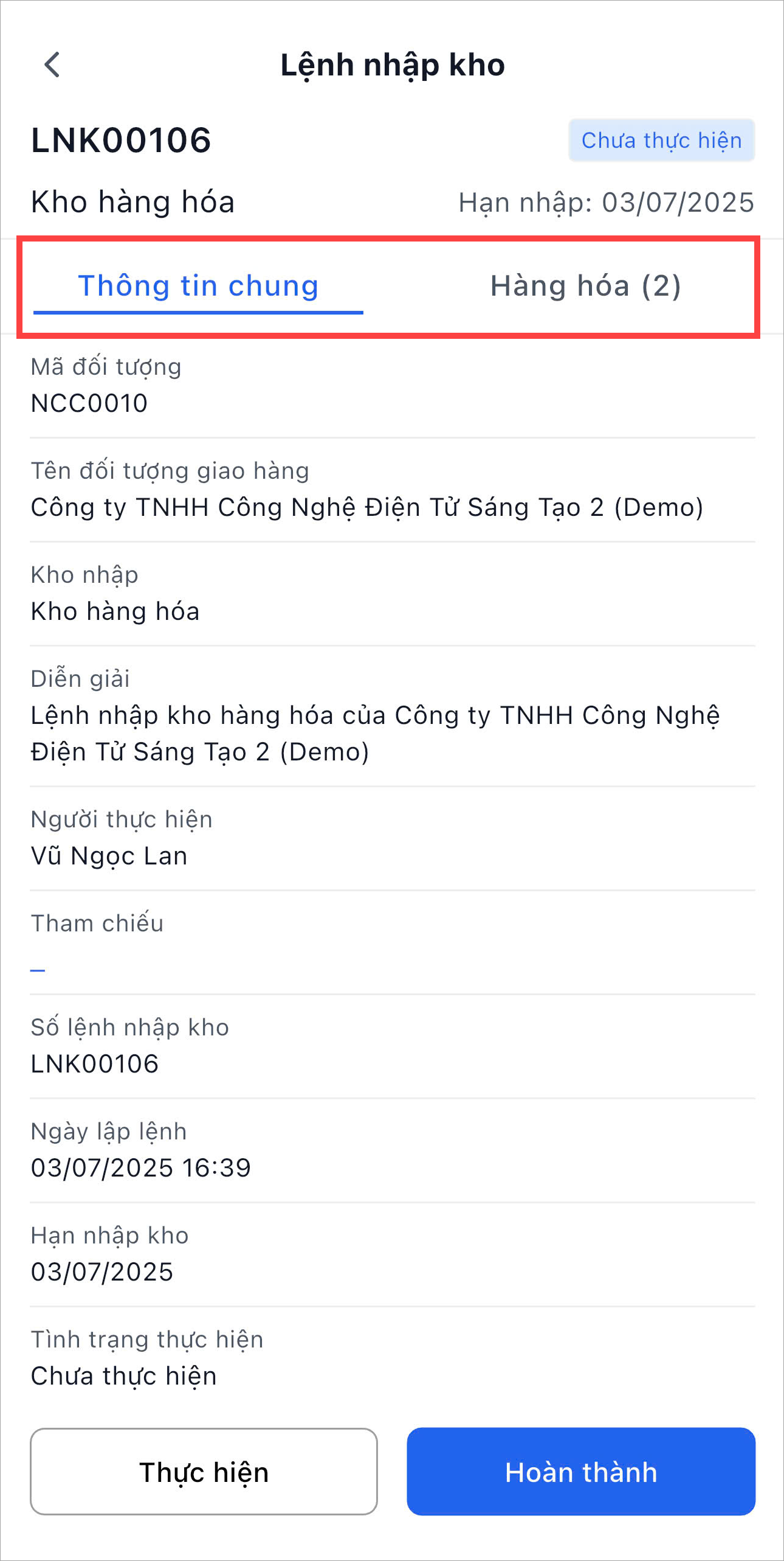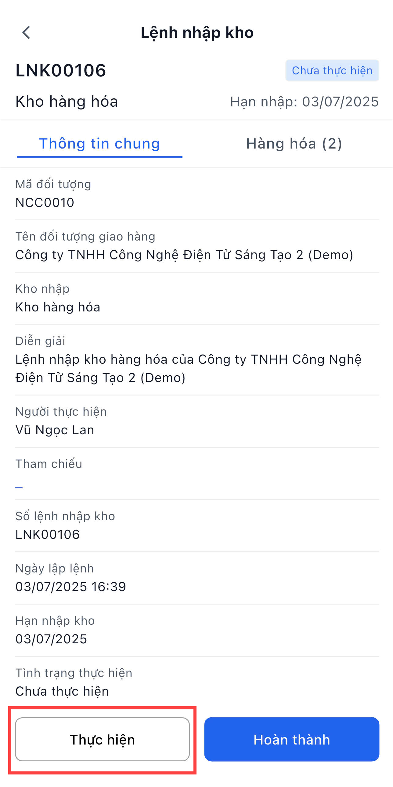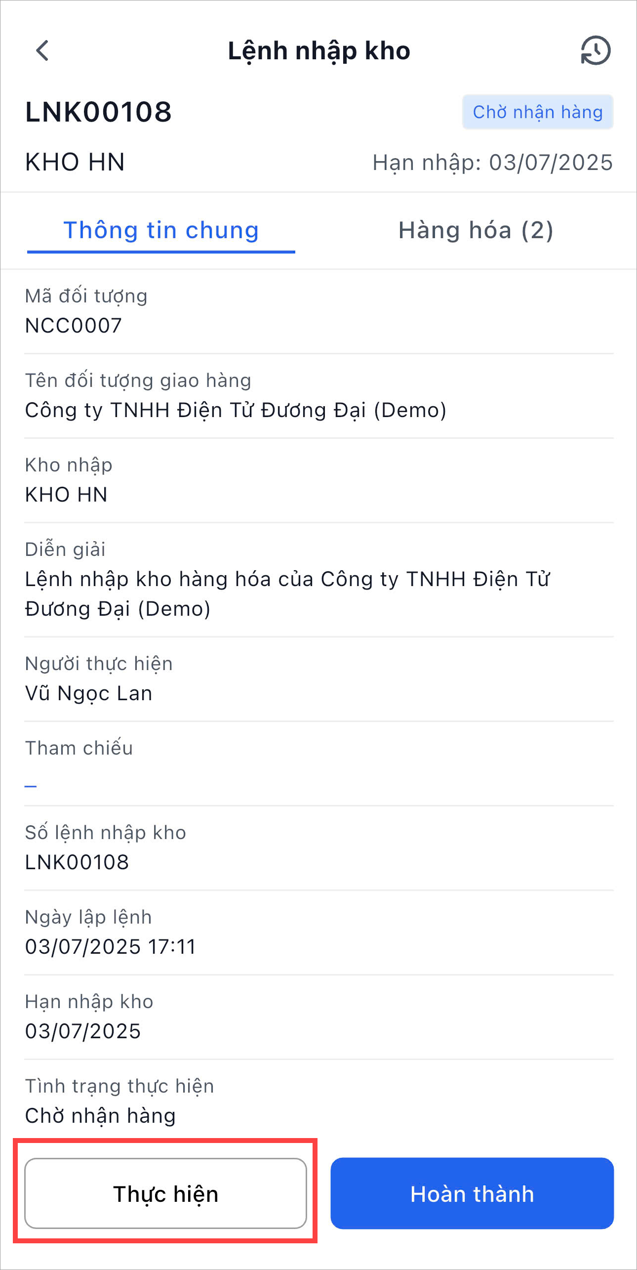 Nhấn Thực hiện để thực hiện nhập kho.
