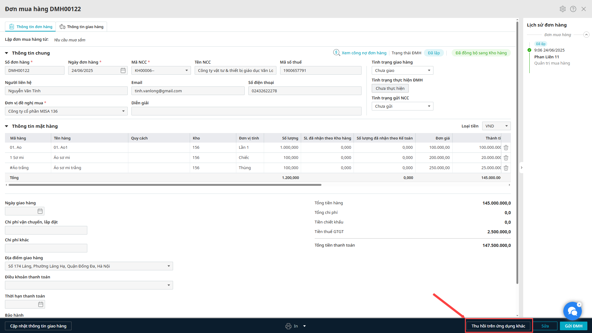Trên AMIS Mua hàng, tại giao diện đơn mua hàng, nếu đơn hàng đã được đồng bộ sang AMIS Kho hàng, nhưng có vấn đề phát sinh cần thu hồi lại đơn mua hàng, nhân viên mua hàng (NVMH) nhấn “Thu hồi trên ứng dụng khác“.