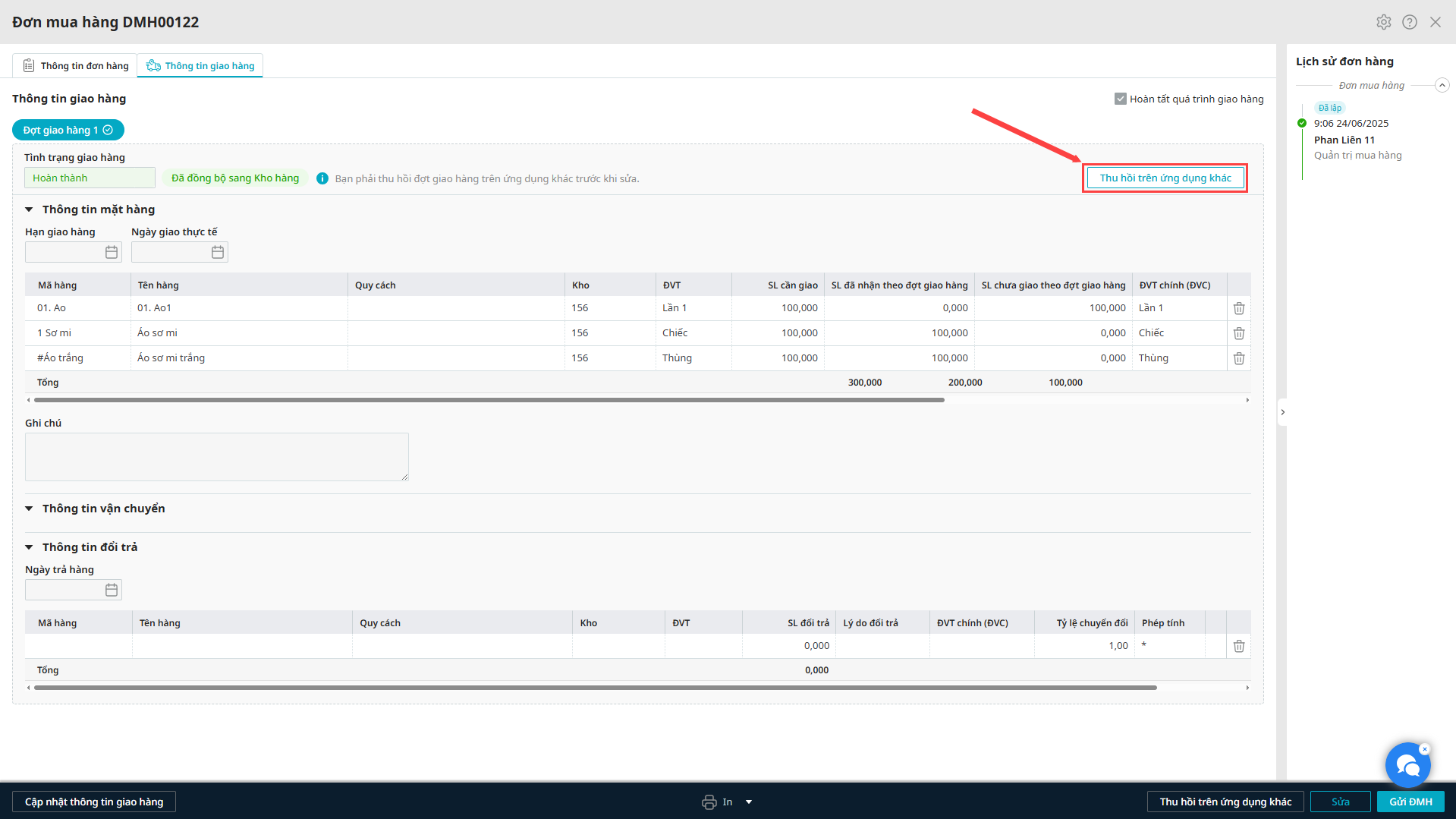 Lưu ý: Không thể thu hồi nếu Đợt giao hàng đã phát sinh lệnh nhập kho có trạng thái khác “Chưa thực hiện”.