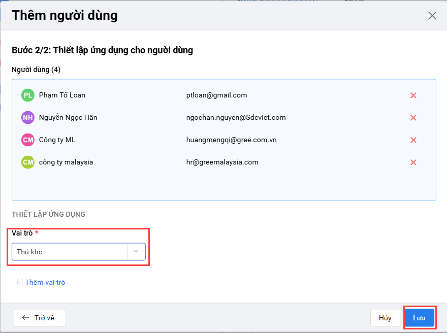 Lưu ý: Chỉ có thể phân quyền sử dụng theo kho cho những người KHÔNG phải quản trị ứng dụng.