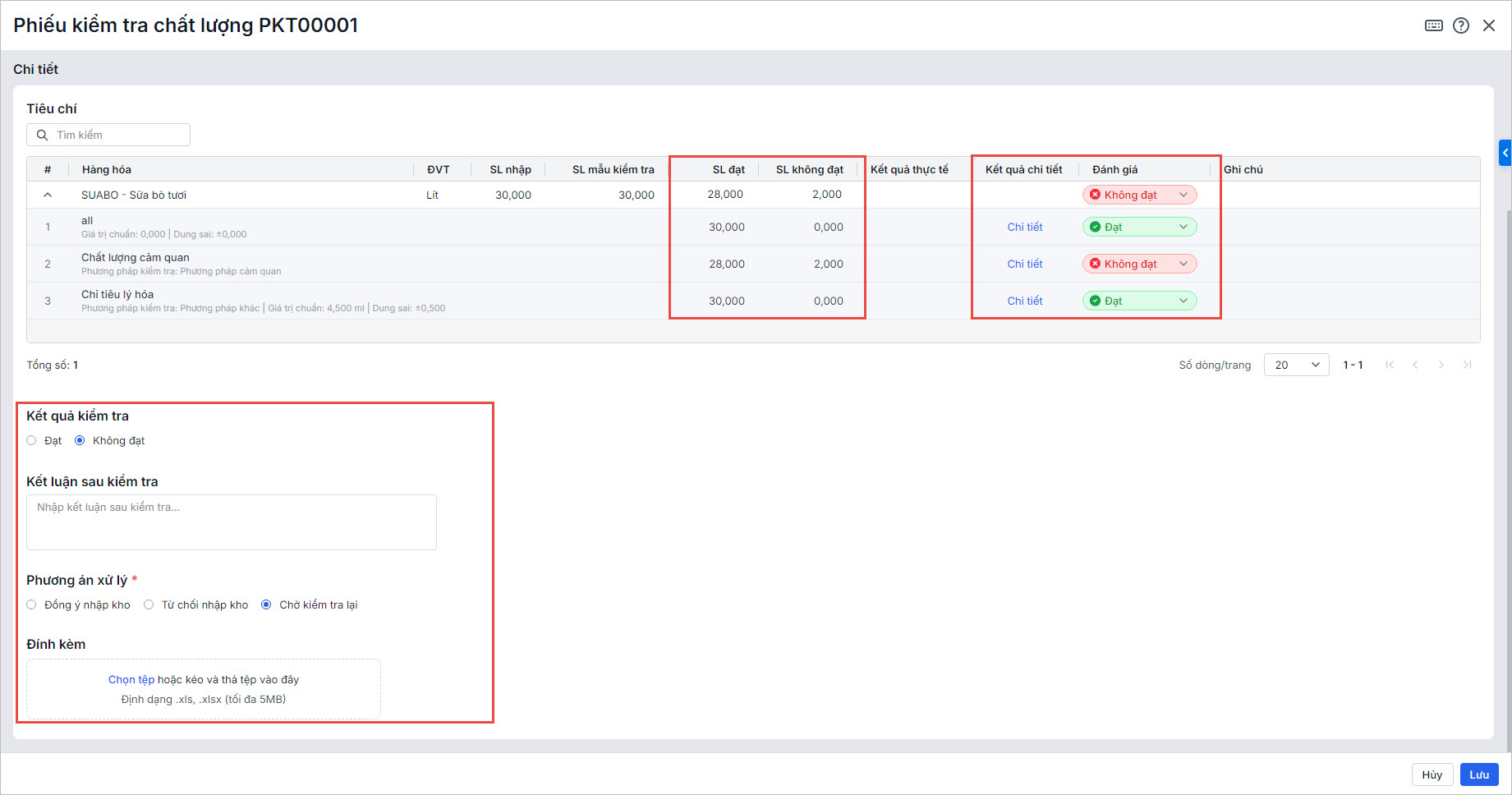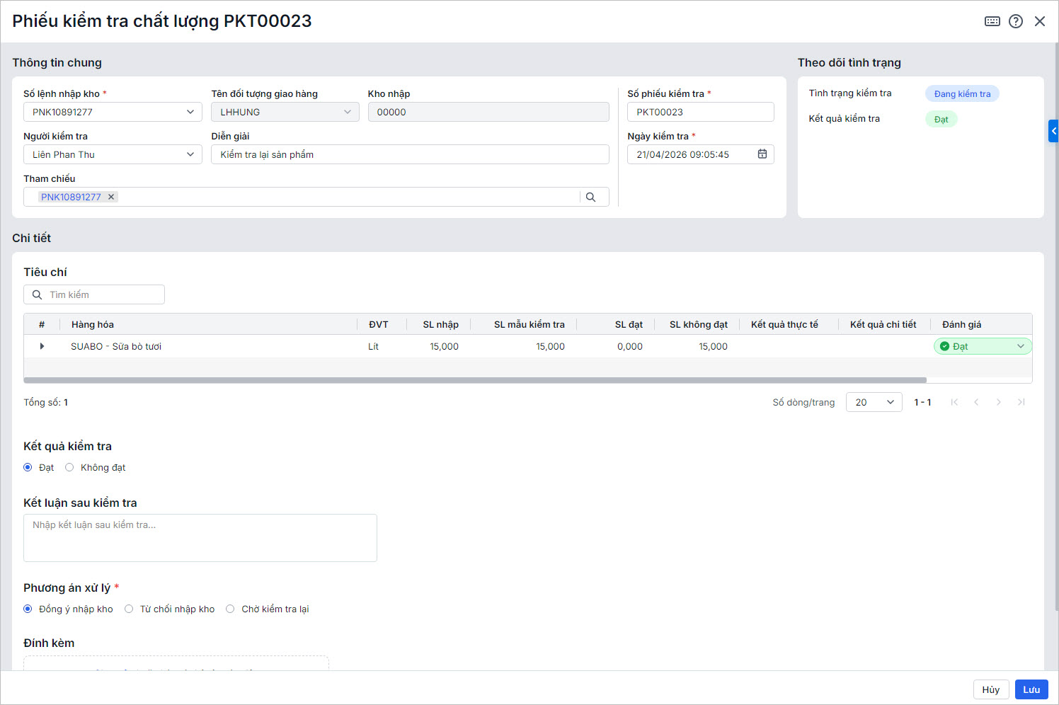 2. Nhấn Sửa, anh/chị Quản lý chất lượng thực hiện nhập chi tiết kết quả kiểm kiểm tra sản phẩm: