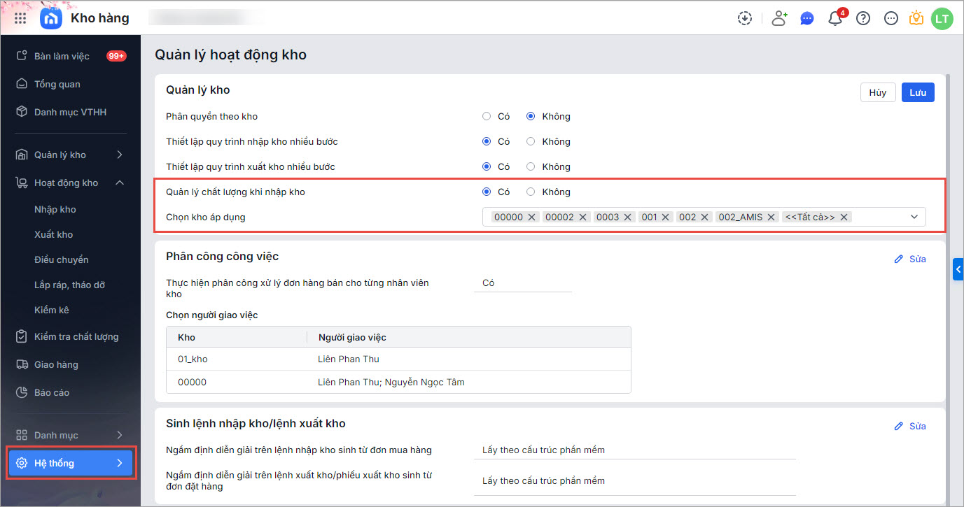 1. Trên menu Hệ thống\Quản lý hoạt động kho,anh chị chọn quản lý chất lượng khi nhập kho và chọn kho áp dụng kiểm tra chất lượng.