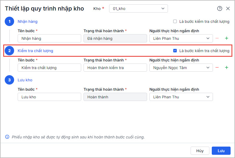 • Tại bước đã xác định là Kiểm tra chất lượng trong quy trình nhập kho, anh/chị chỉ cần tích chọn checkbox “Là bước kiểm tra chất lượng”.