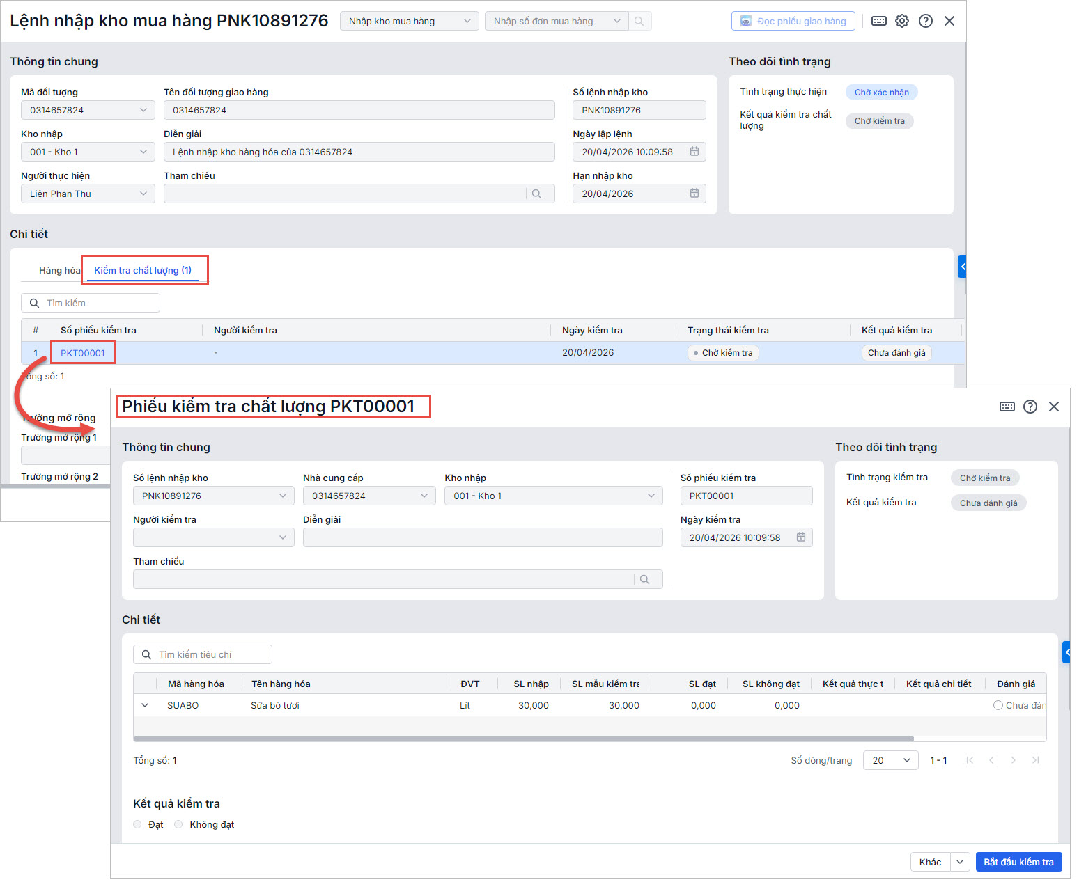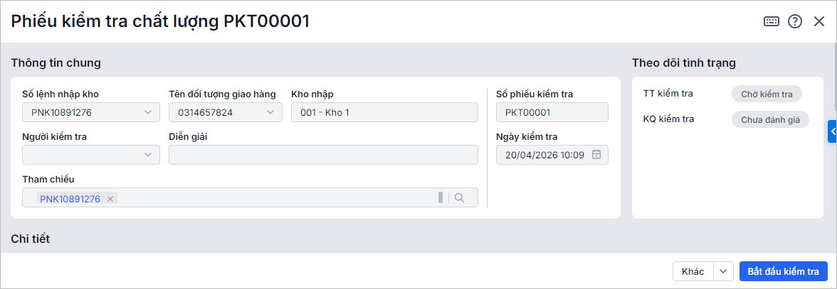 • Với lệnh nhập kho 1 bước: Khi lập lệnh nhập kho cho Kho có áp dụng kiểm tra chất lượng (thiết lập tại Bước 1), chương trình sẽ tự động sinh phiếu kiểm tra chất lượng ngay sau khi Lưu lệnh.