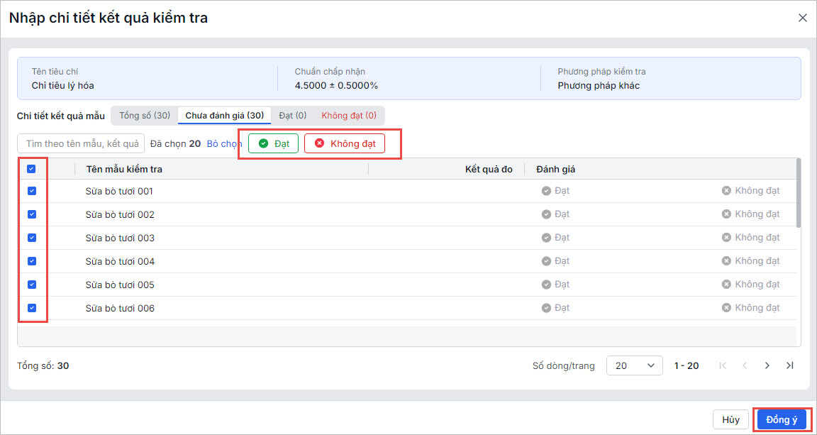 • Kết quả chi tiết: Anh/chị có thể nhấn vào “Chi tiết“, chương trình sẽ hiển thị danh sách tất cả các sản phẩm, anh/chị có thể chọn kết quả Đạt/Không đạt cho từng sản phẩm một.