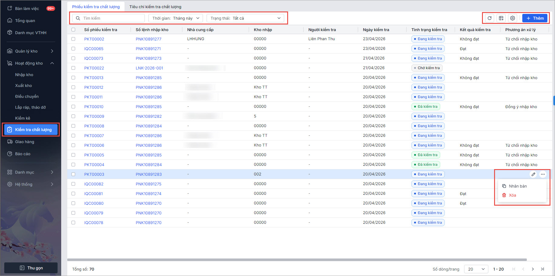 • Thêm/Sửa/Xóa/Nhân bản phiếu kiểm tra chất lượng.