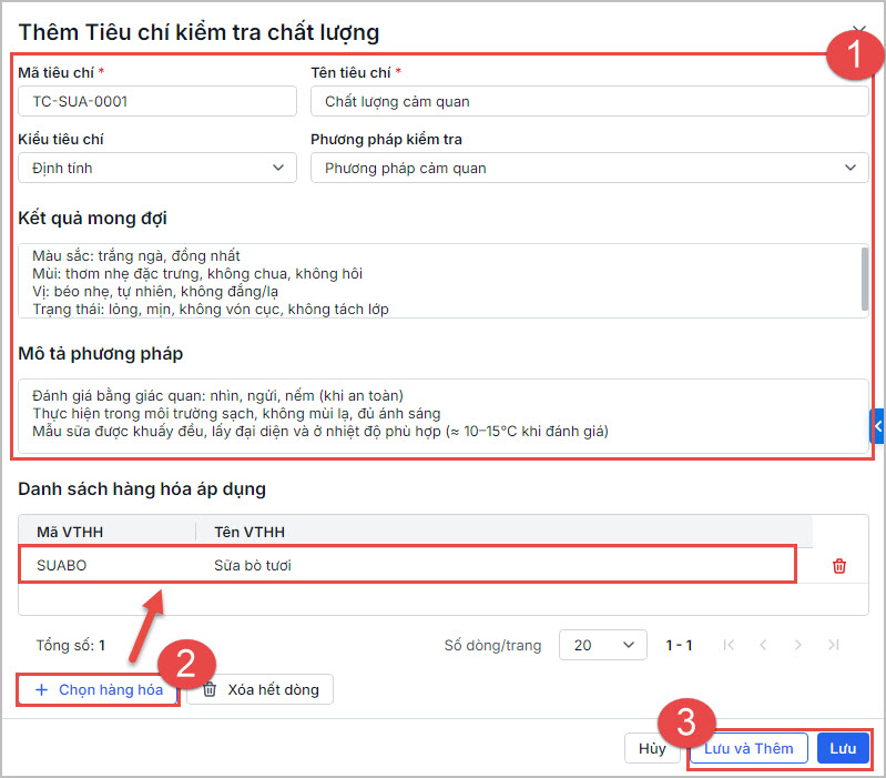 Anh/chị khai báo và quản lý các tiêu chí kiểm tra chất lượng cho VTHH tương ứng. Xem tại đây