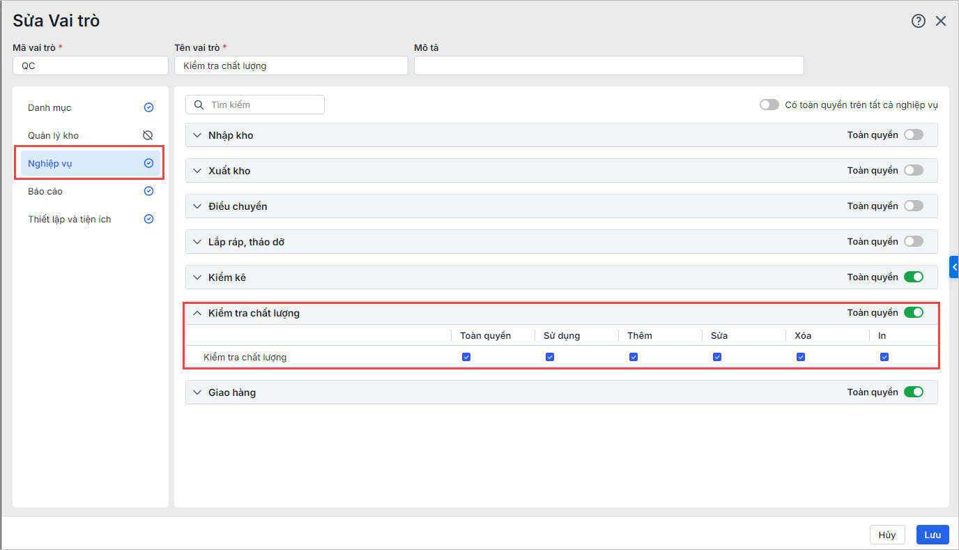 2. Anh chị thực hiện phân quyền Nghiệp vụ\Kiểm tra chất lượng cho bộ phận QC theo hướng dẫn tại đây