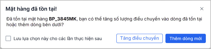 - Nếu hàng hóa đã có trên chứng từ: Phần mềm hiển thị thông báo để anh/chị lựa chọn thêm dòng mới hay cập nhật vào dòng cũ.