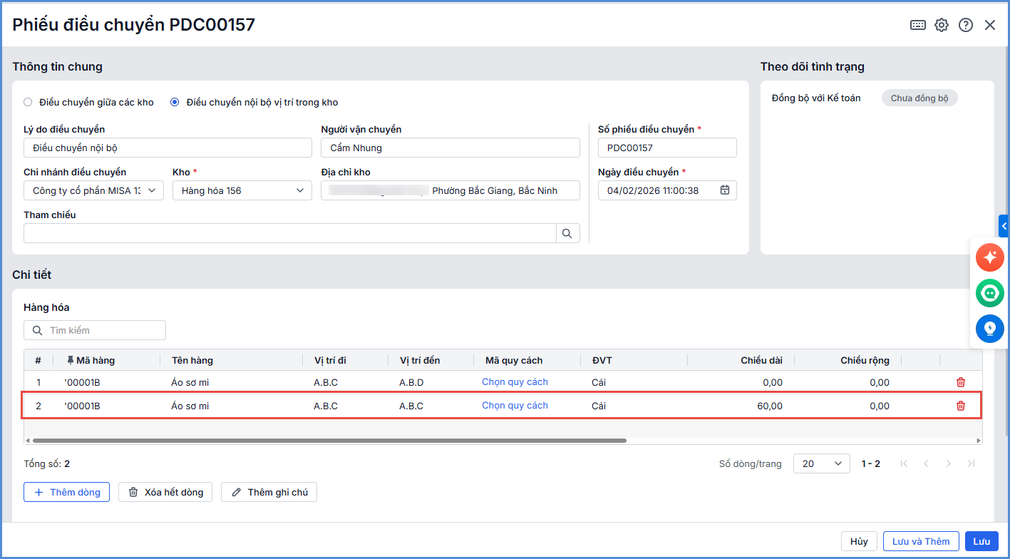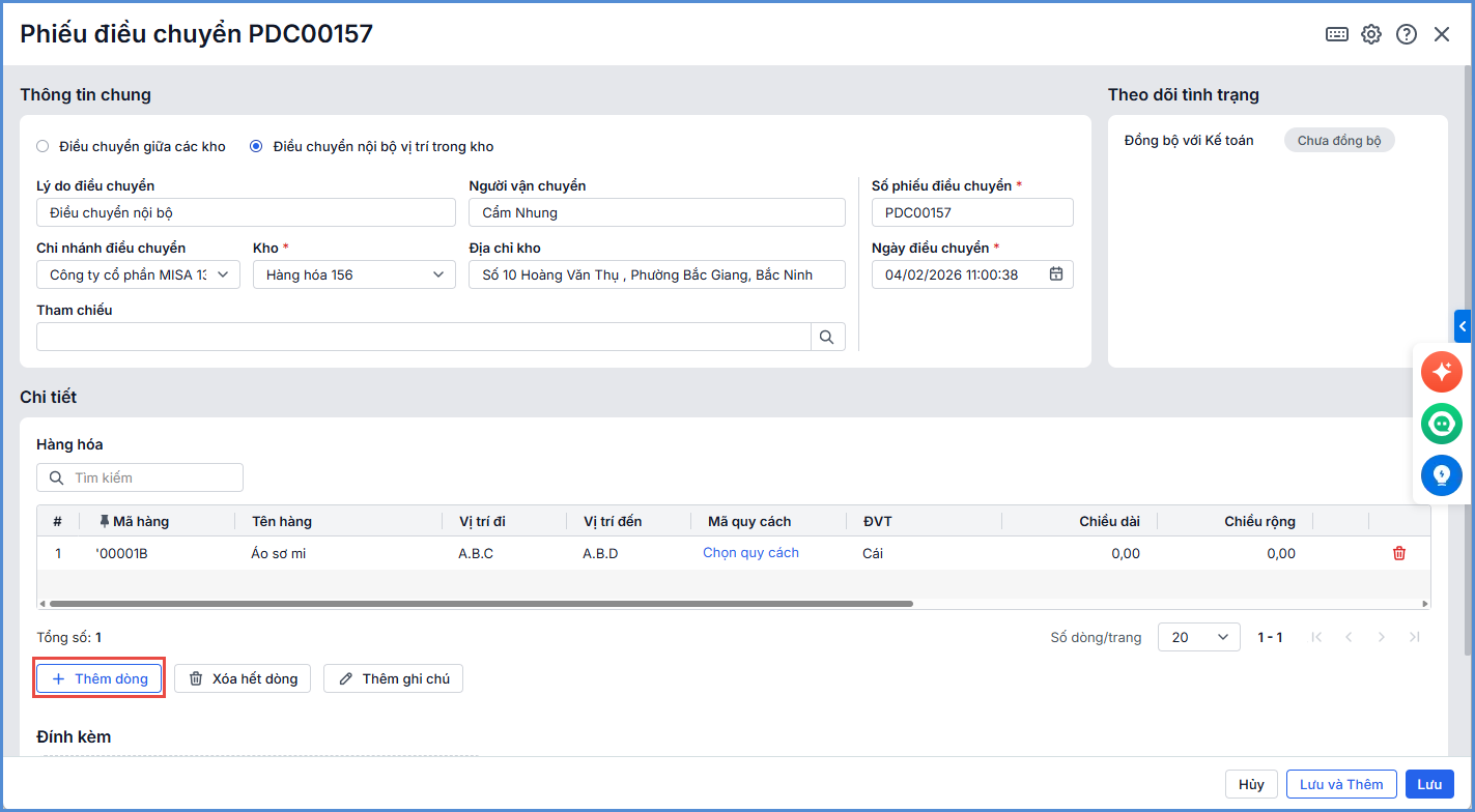 • Trên giao diện phiếu điều chuyển chọn Thêm dòng.