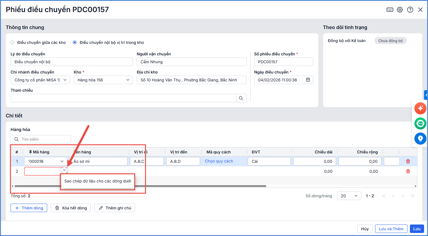 Nội dung tổng quan bao gồm: Cách sử dụng tính năng sao chép dòng trên phiếu điều chuyển và các lưu ý liên quan.