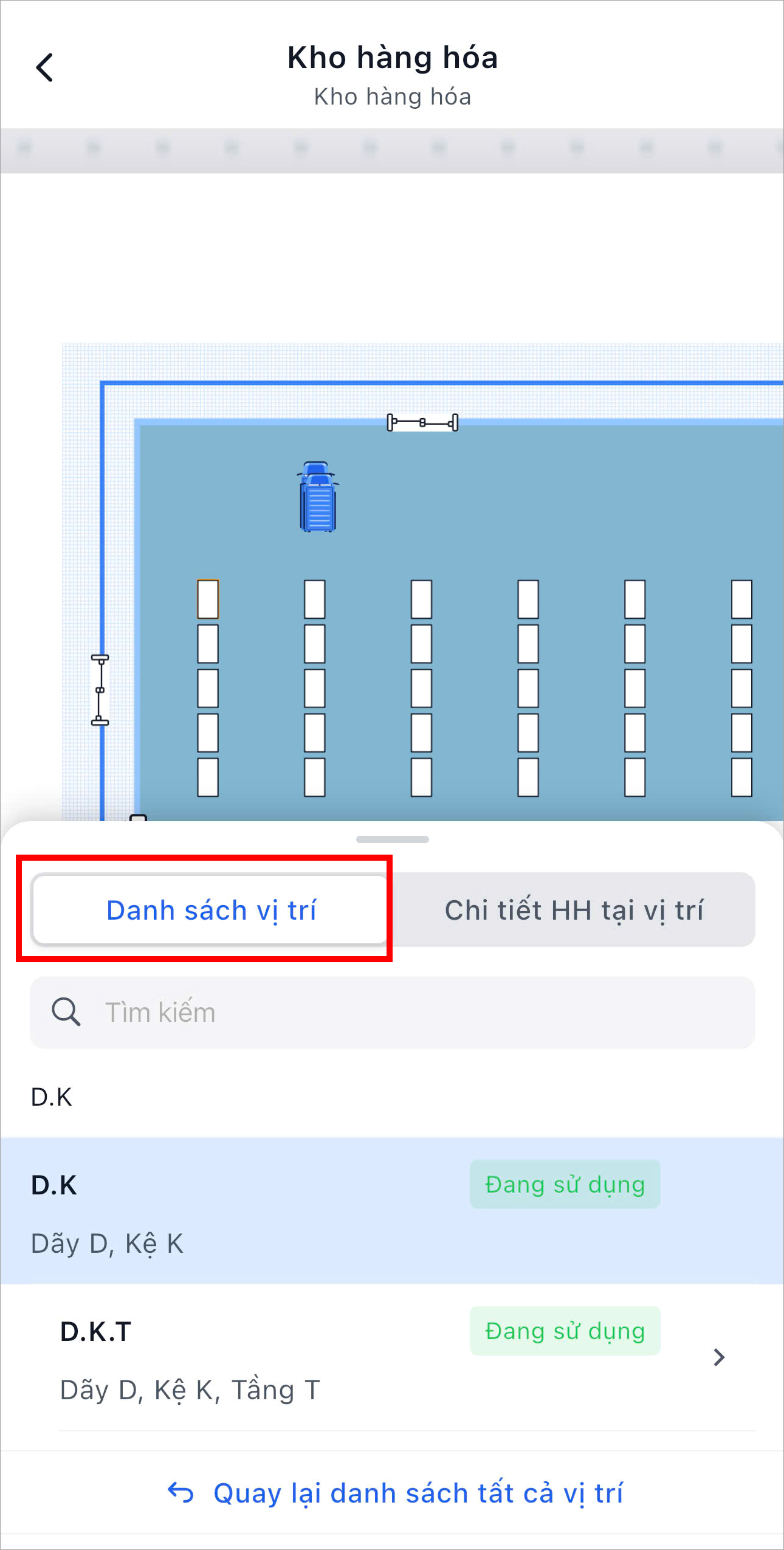 - Danh sách vị trí: hiển thị danh sách toàn bộ các vị trí đã được tạo/được ghép trên sơ đồ. Hệ thống sẽ tô đậm vị trí đang chọn.