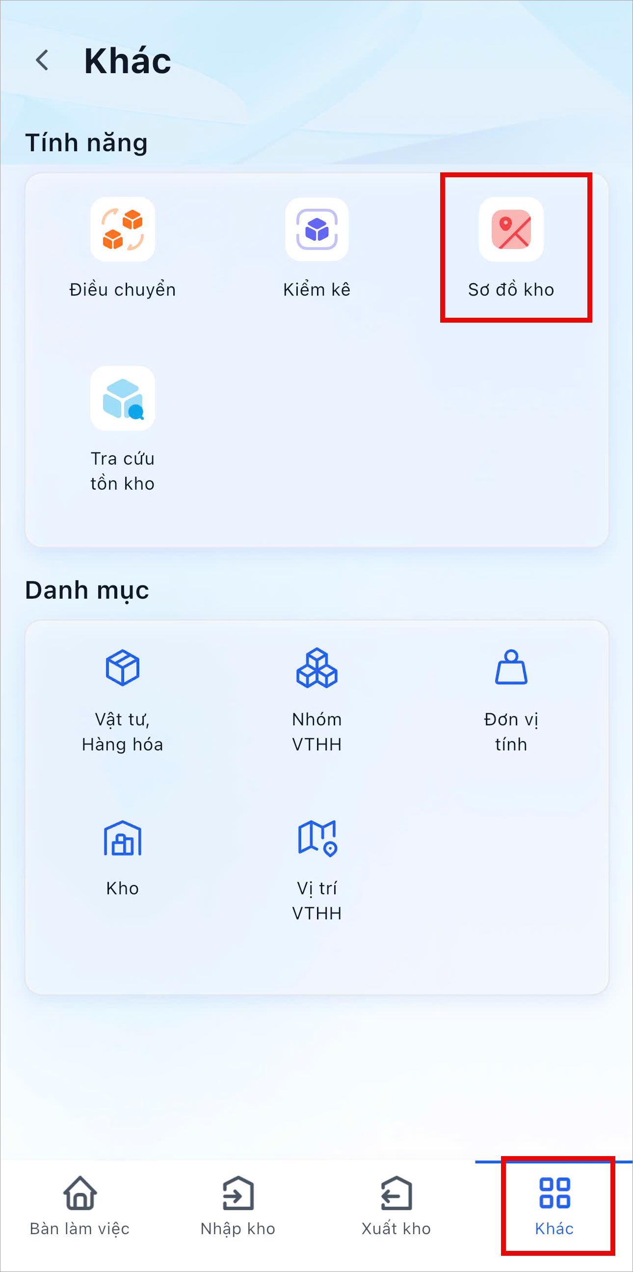 Trên ứng dụng AMIS Kho hàng mobile, vào phân hệ Khác\Sơ đồ kho.