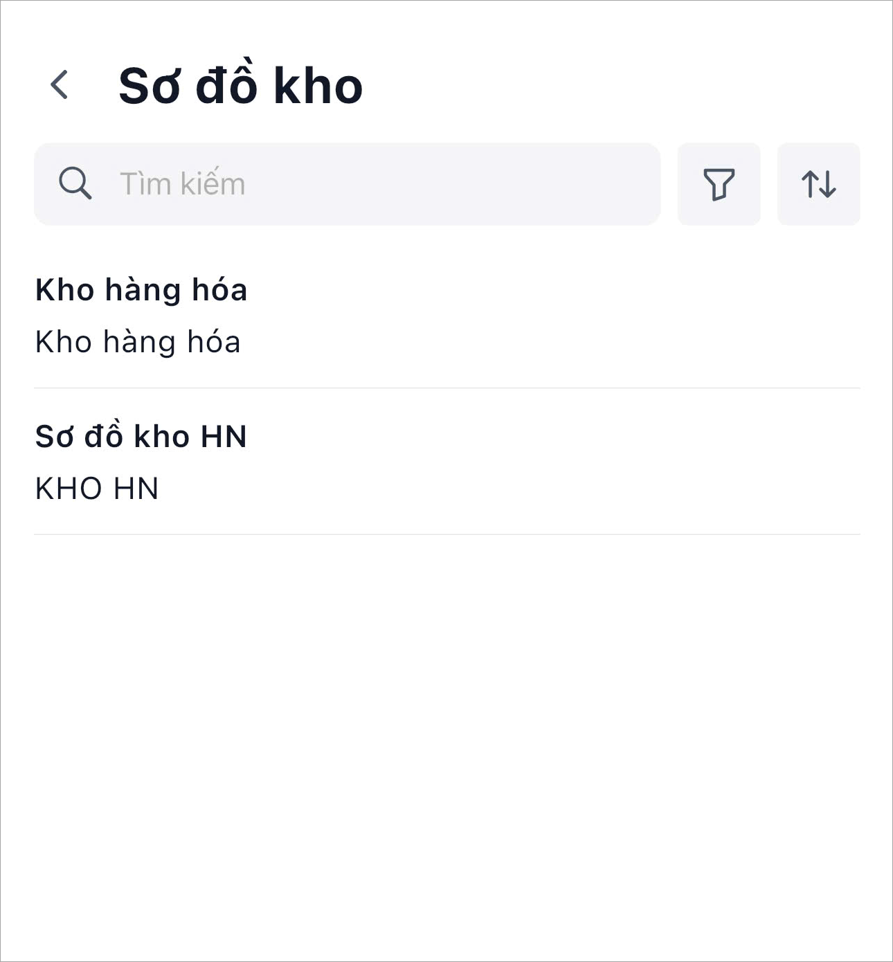 Anh/Chị có thể tìm kiếm, sắp xếp hiển thị, lọc theo Kho.