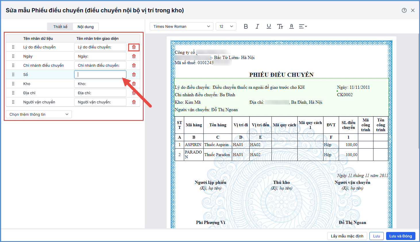 - Thiết kế mẫu Phiếu điều chuyển: cho phép người dùng chỉnh sửa hiển thị: