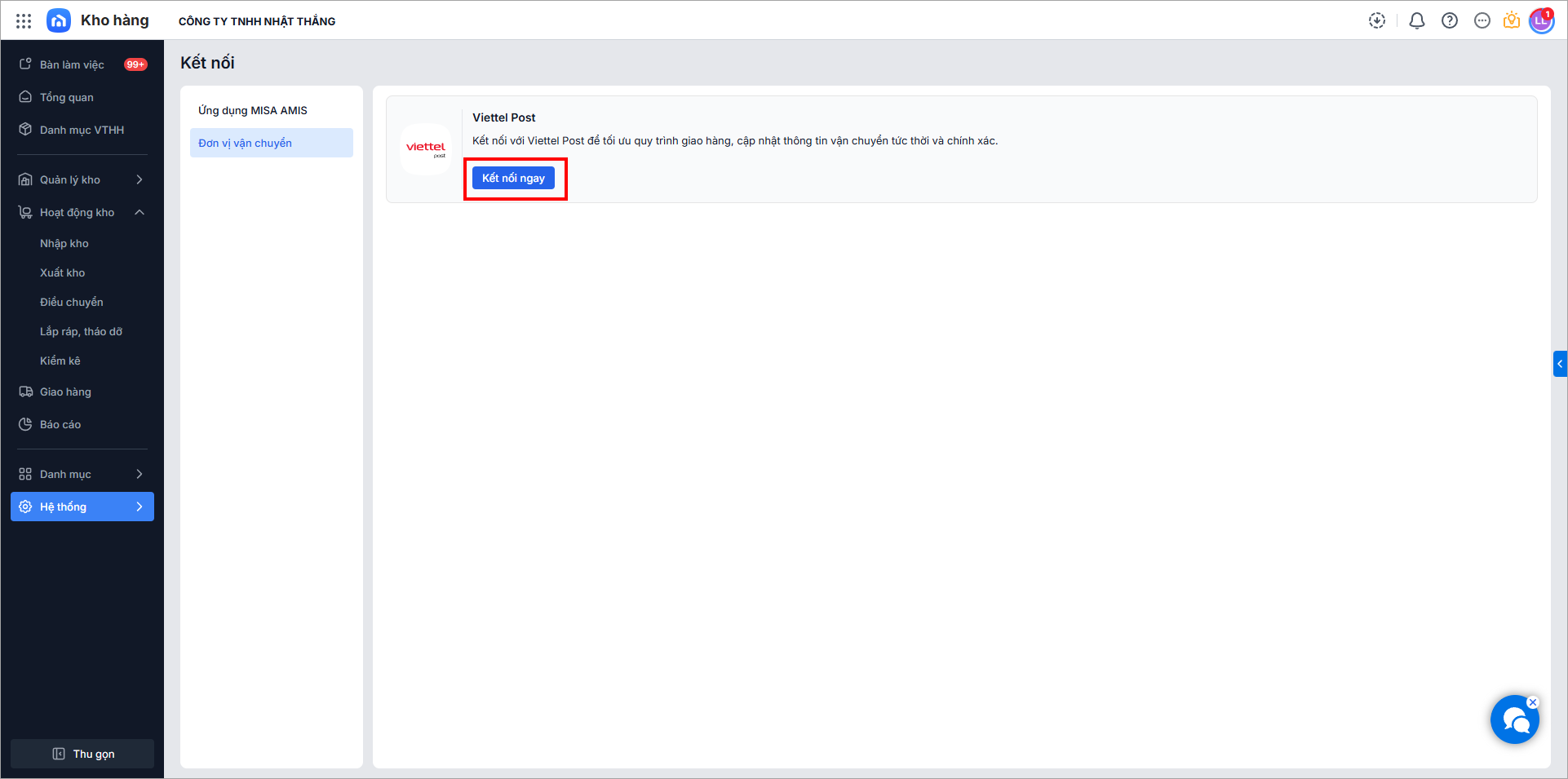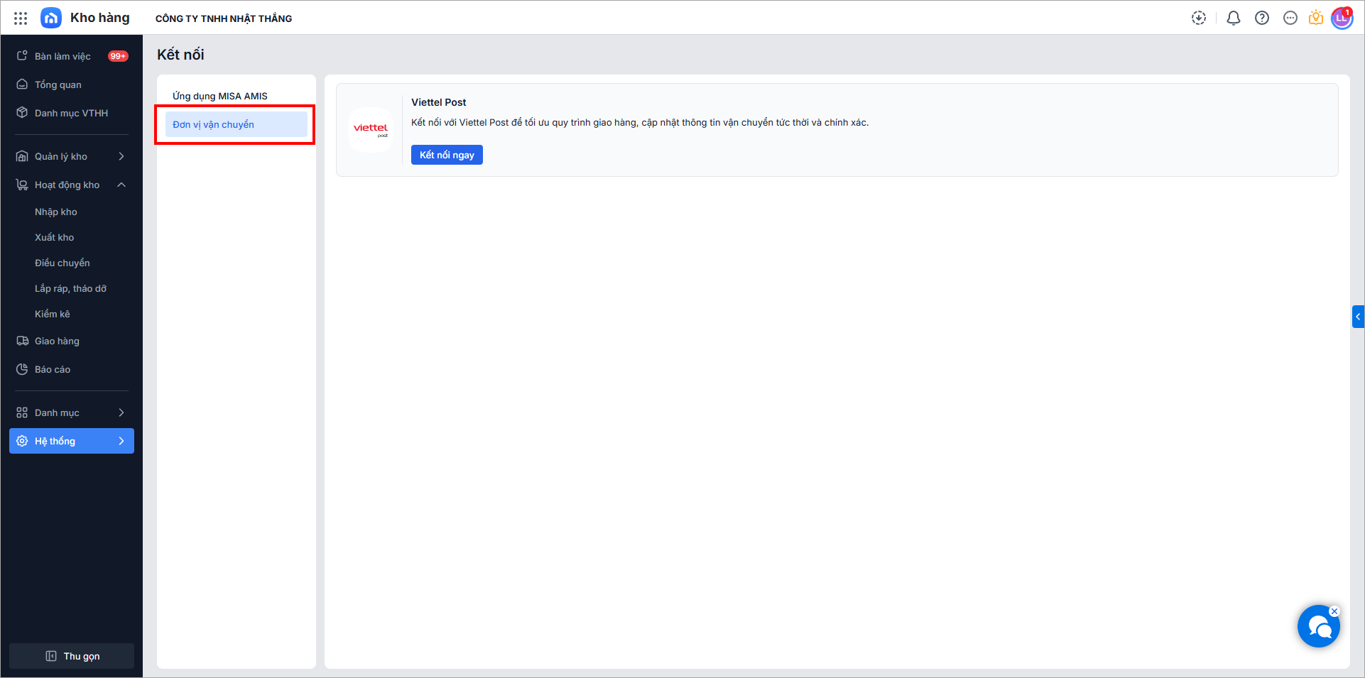 Hiện tại, AMIS Kho chỉ đáp ứng kết nối với đơn vị vận chuyển Viettel Post.