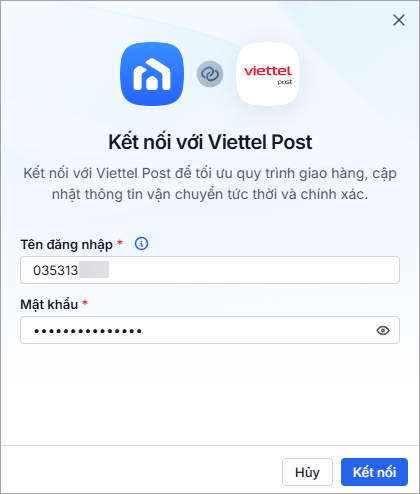 Nhập thông tin Tên đăng nhậpMật khẩu tài khoản Viettel Post. Sau đó nhấn Kết nối.