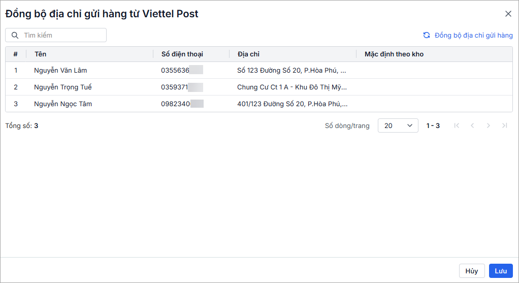 Tại thiết lập Đồng bộ địa chỉ gửi hàng từ Viettel Post, hệ thống hiển thị danh sách các địa chỉ gửi hàng đang hoạt động trên Viettel Post của tài khoản đã kết nối.