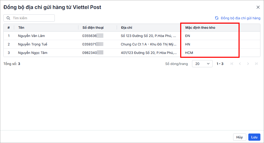 Ở cột Mặc định theo kho, chọn kho mặc định theo từng địa chỉ gửi hàng.
