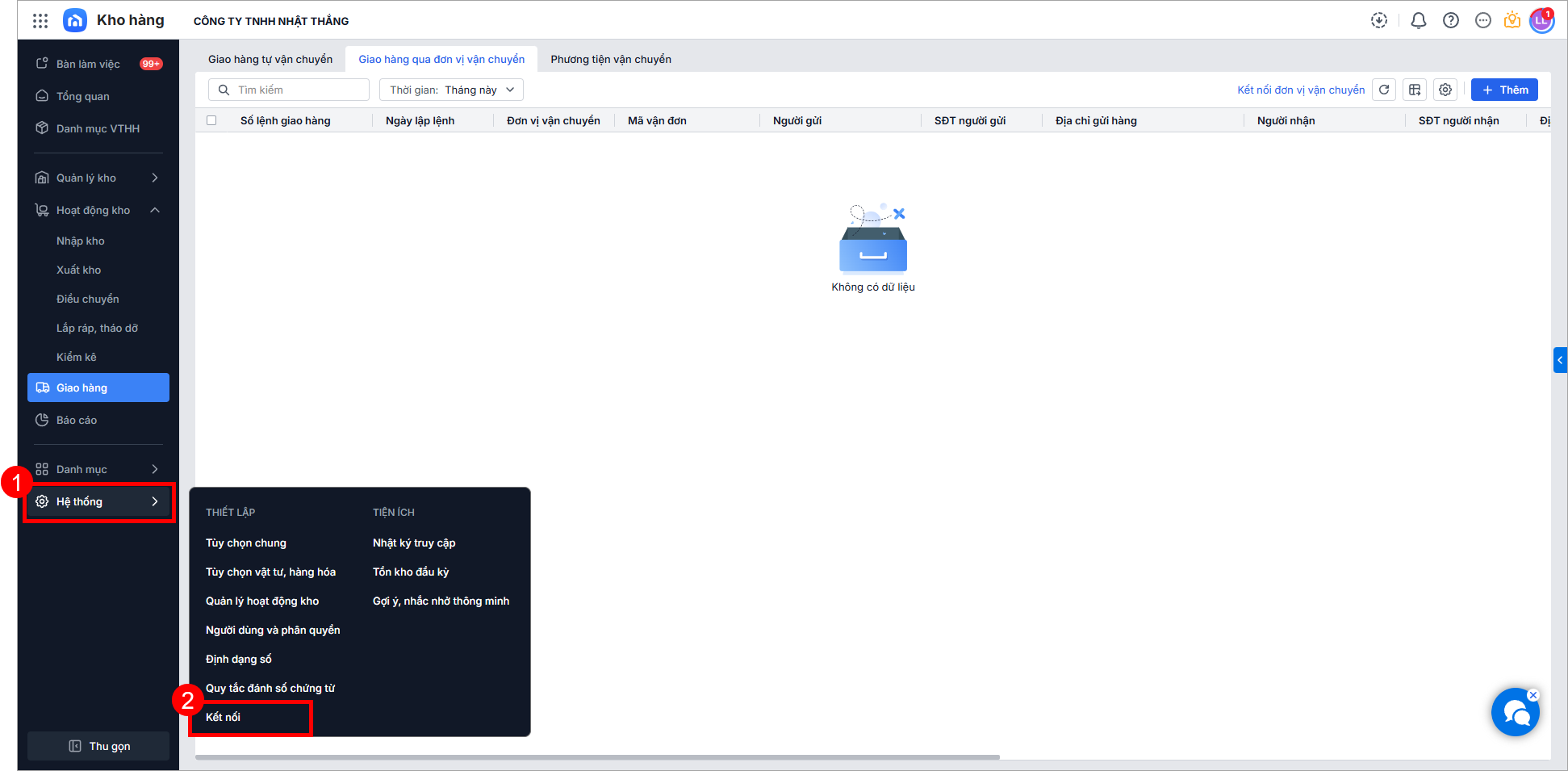 Lưu ý: Người dùng cần được phân quyền sử dụng Thiết lập và tiện ích\Thiết lập kết nối đơn vị vận chuyển để thực hiện được chức năng này.