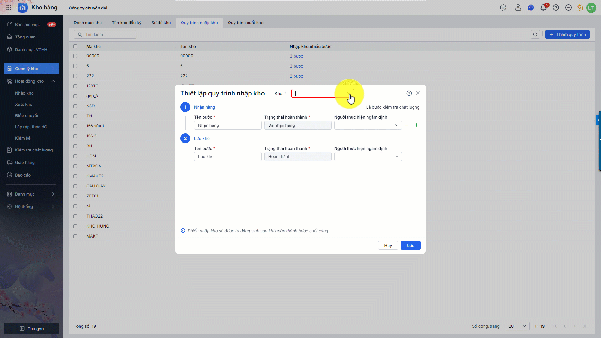 2. Thiết lập quy trình nhập kho của các kho theo từng bước:
