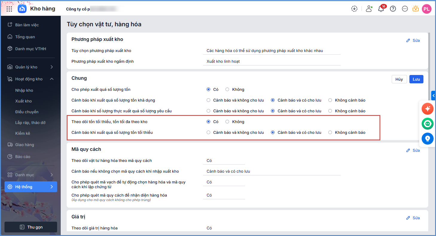 Tại mục Tuỳ chọn vật tư hàng hóa, người dùng sẽ thiết lập tuỳ chọn liên quan đến: Khi lệnh xuất kho được tạo tự động, hệ thống sẽ ngầm định chọn các loại vật tư, hàng hóa phục cần xuất, tùy thuộc vào phương pháp xuất kho của đơn vị, cụ thể: Lưu ý: Không áp dụng quy tắc này đối với các chứng từ xuất kho tạo thủ công. Tùy chọn Cảnh báo khi xuất quá số lượng tồn khả dụng với các lựa chọn sau: Cảnh báo và không cho lưu (mặc định): phần mềm sẽ cảnh báo khi người dùng xuất quá số lượng tồn kho khả dụng và không cho lưu các chứng từ xuất kho có mặt hàng xuất vượt quá số lượng tồn kho. Cảnh báo và có cho lưu: phần mềm hiển thị cảnh báo quá số lượng tồn kho khả dụng, người dùng có thể lựa chọn Lưu hoặc không lưu chứng từ này, bởi vì việc Lưu sẽ ảnh hưởng đến cam kết giữ hàng cho khách. Có: Nếu bạn muốn phần mềm theo dõi hàng hóa chi tiết đến từng vị trí trong kho. Không: Nếu chỉ cần quản lý tổng thể số lượng hàng hóa, không cần phân vị trí cụ thể. Thiết lập In vã vạch/QR: Quy định ký tự ngăn cách giữa các phần thông tin trong mã vạch/mã QR (ví dụ: Mã hàng, Số lô, Hạn sử dụng). Nhấn vào biểu tượng Sửa ở góc phải mục In mã vạch/Mã QR. Nhập ký tự muốn dùng làm dấu ngăn cách (ví dụ: Ví dụ: 2.2. Tùy chọn vật tư, hàng hóa