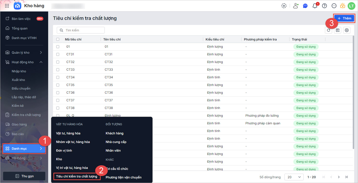 • Vào Danh mục\Tiêu chí kiểm tra chất lượng, nhấn Thêm (Hoặc, trên phân hệ Kiểm tra chất lượng\Tiêu chuẩn, tab Tiêu chí chất lượng, nhấn Thêm)