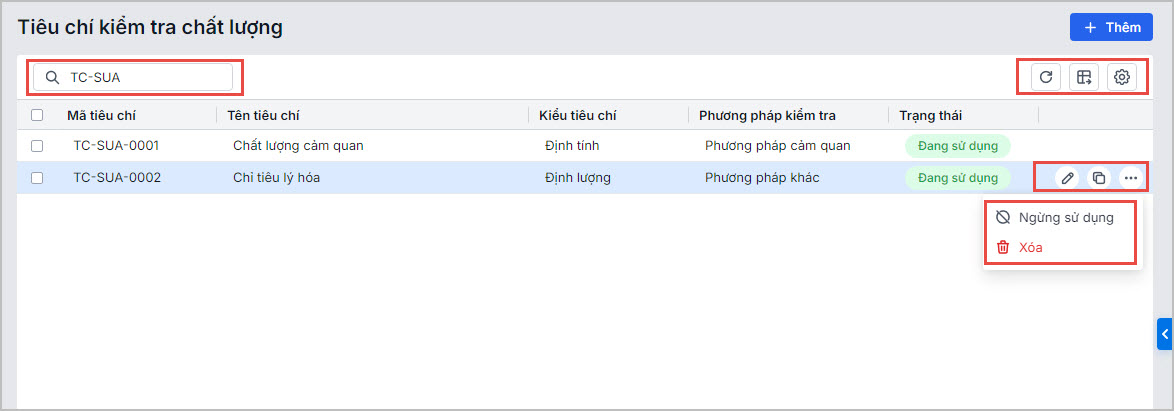 • Sửa/Xóa/Nhân bản/Ngừng sử dụng tiêu chí chất lượng