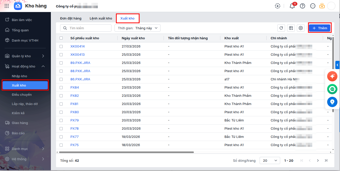 - Tại phân hệ Hoạt động kho, chọn mục Xuất kho, nhấn Thêm phiếu xuất kho.