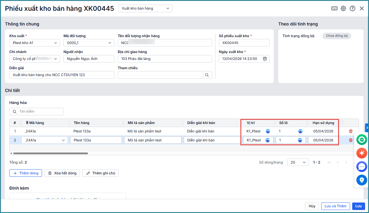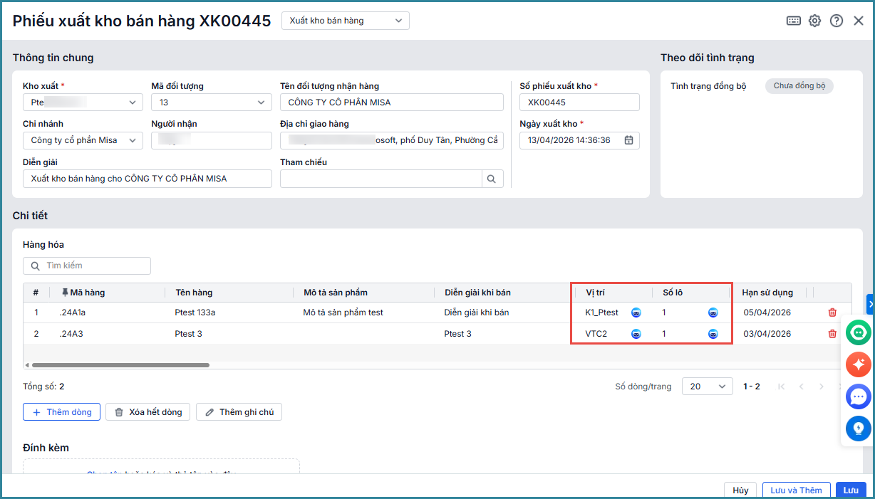 - Tại giao diện Phiếu xuất kho, khi người dùng thực hiện khai báo thông tin hàng hóa, Trợ lý số MISA AVA sẽ gợi ý số lô, hạn sử dụng theo phương pháp hết hạn trước xuất trước.