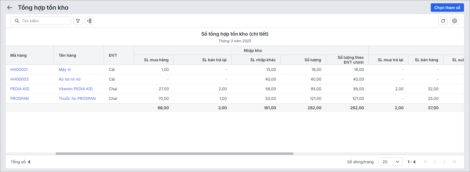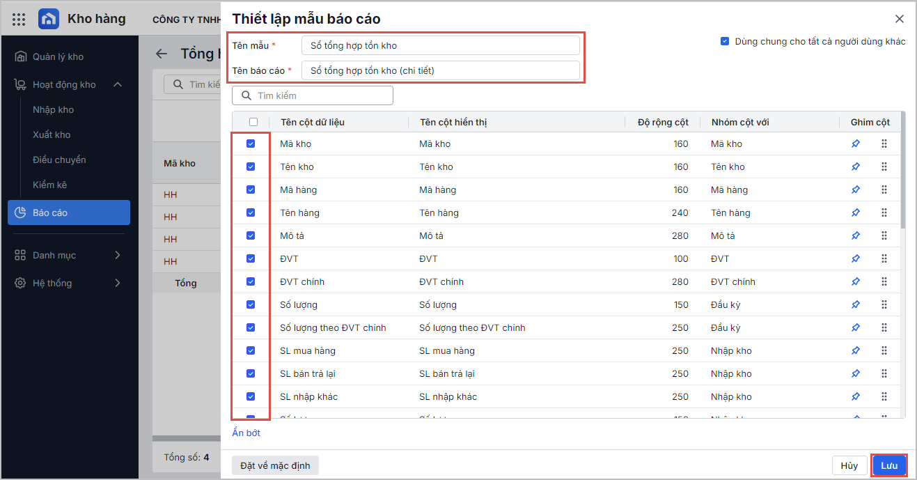 - Nhập tên báo cáo: sẽ hiển thị khi xem và in báo cáo. Ví dụ: Sổ tổng hợp tồn kho (chi tiết)