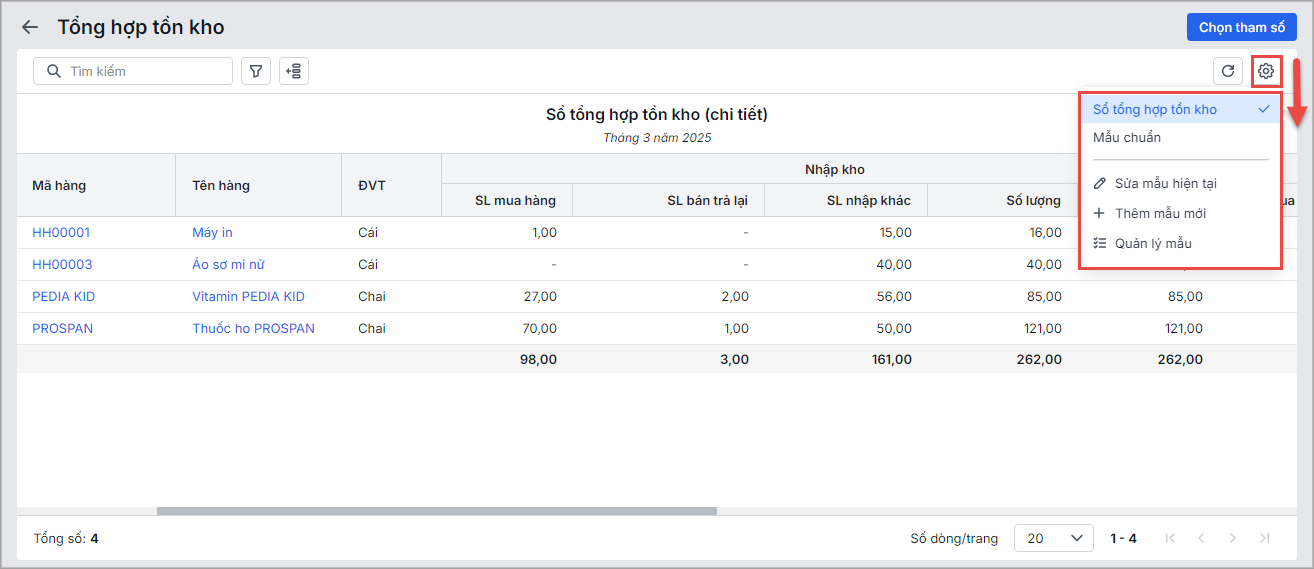 - Trên giao diện Báo cáo (Ví dụ: Số tổng hợp tồn kho…), nhấn vào biểu tượng bánh răng góc phải phía trên\chọn Thêm mẫu mới