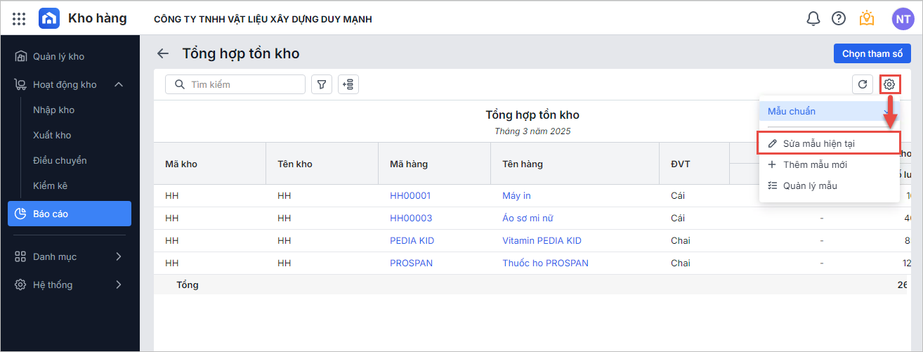 - Trên giao diện Báo cáo (Ví dụ: Số tổng hợp tồn kho…), nhấn vào biểu tượng bánh răng góc phải phía trên\chọn Sửa mẫu hiện tại để tùy chỉnh giao diện:
