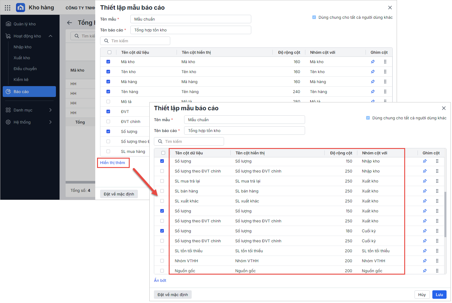 + Nếu cần hiển thị thêm các cột thông tin khác của loại Báo cáo đó để tích/bỏ tích chọn: thì bạn nhấn “Hiển thị thêm” để hiển thị đầy đủ các thông tin khác để tích chọn/bỏ tích chọn