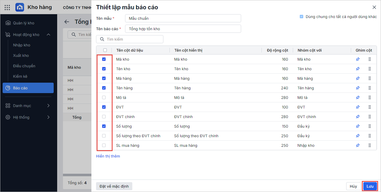 - Tích chọn các cột thông tin cần hiển thị trên báo cáo.