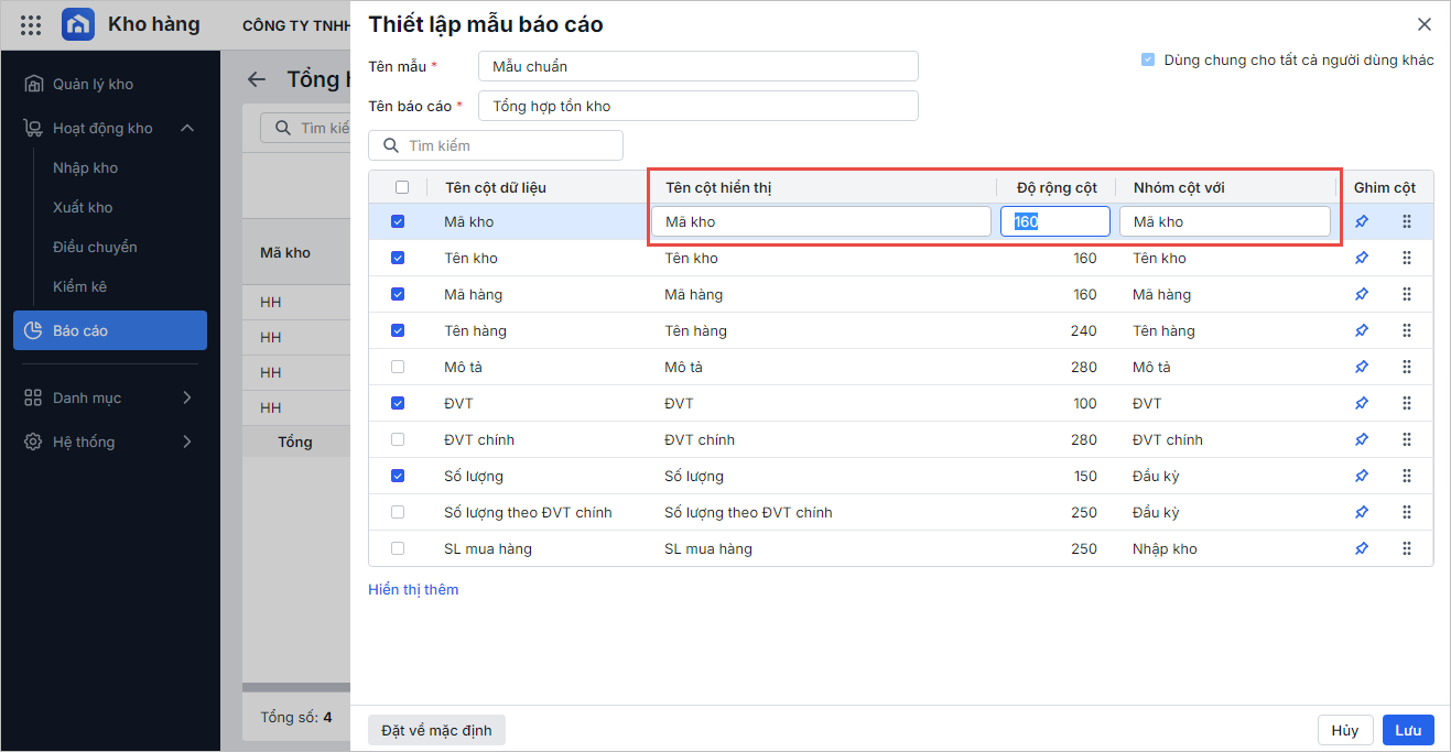 + Nếu cần Sửa tên cột hiển thị, Độ rộng cột: Chọn dòng cần sửa tên cột hiển thị và độ rộng