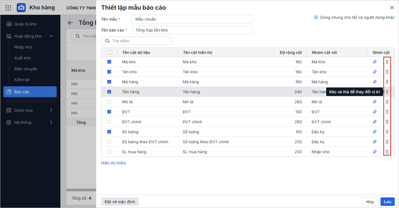 - Tại bảng Tùy chỉnh giao diện, tích chọn các cột muốn hiển thị trên Báo cáo