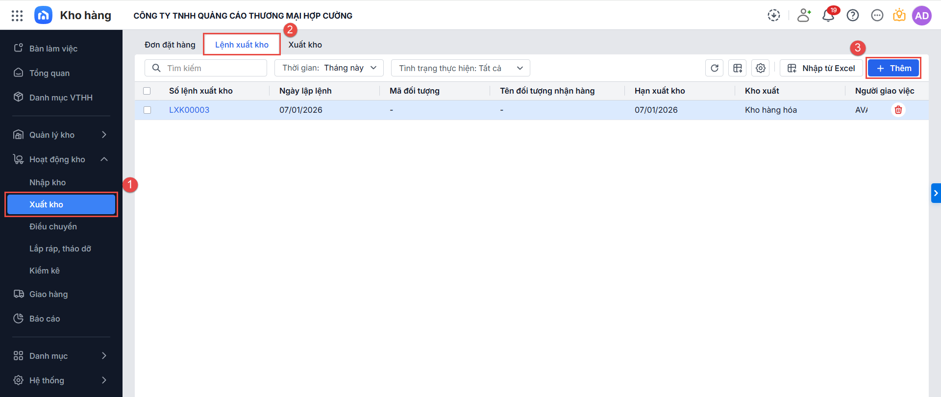 1. Trên ứng dụng AMIS Kho hàng, vào phân hệ Hoạt động kho/ Xuất kho, tab Lệnh xuất kho, nhấn Thêm