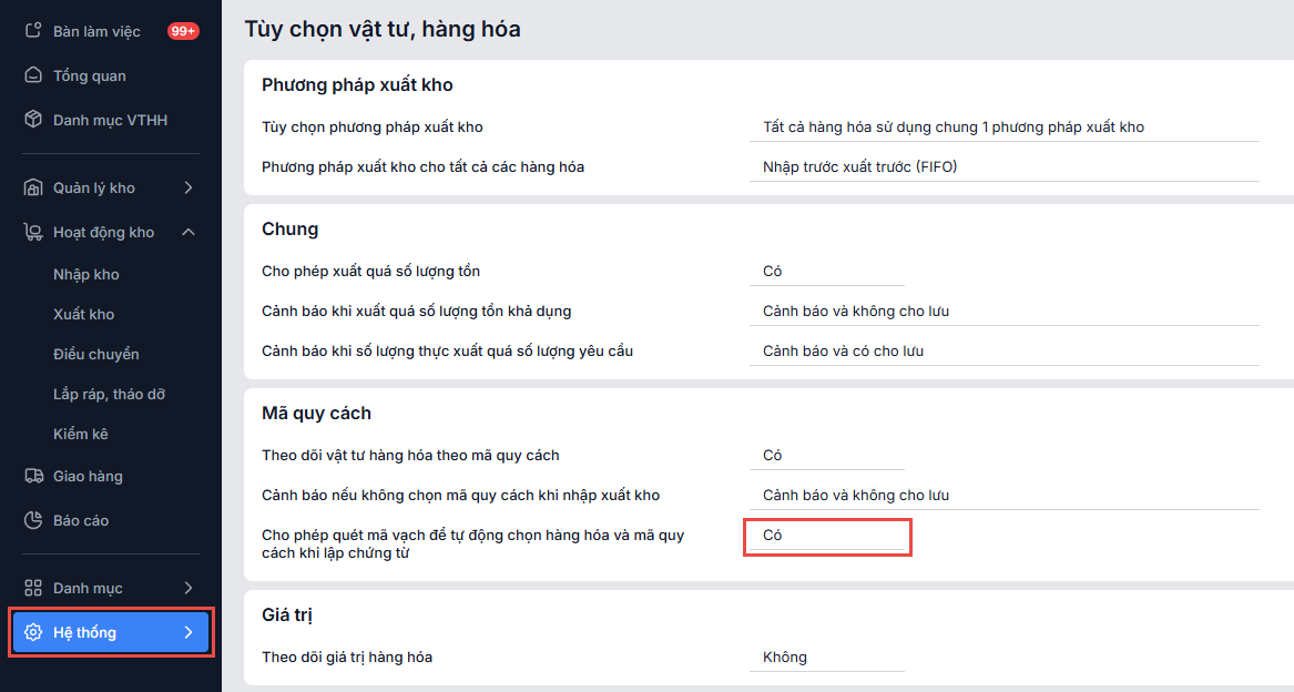 • Khi quét mã, hệ thống sẽ tự động tìm và chọn đúng hàng hóa cùng mã quy cách đó để xuất kho.