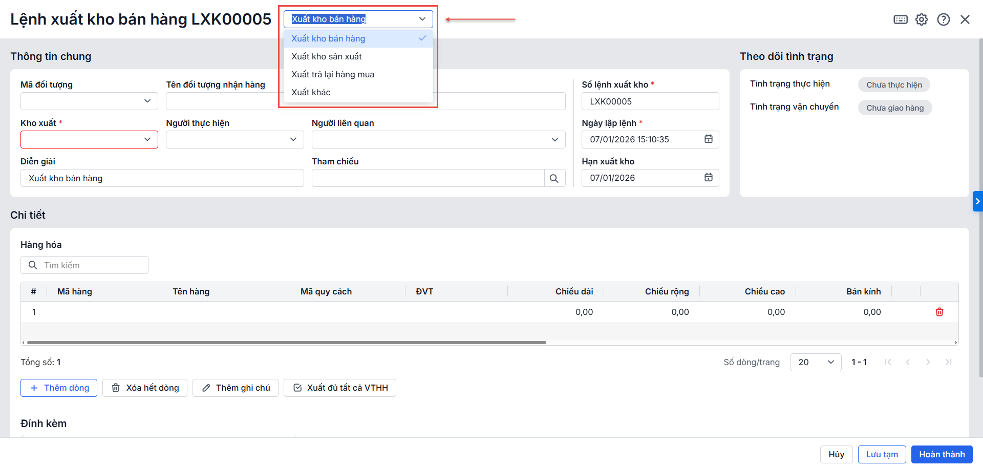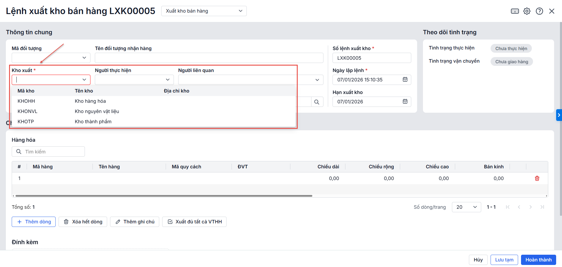 2. Chọn loại xuất kho phù hợp và kho xuất hàng hóa
