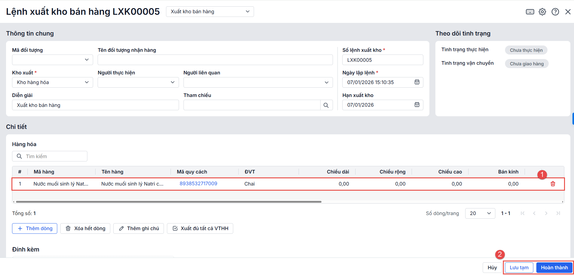 • Số lượng thực xuất của dòng hàng hóa sẽ là 1.