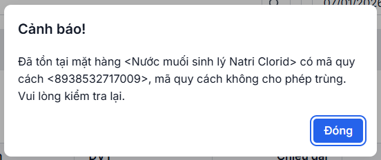 • Nếu quét trùng một mã quy cách đã có trên chứng từ, hệ thống sẽ hiển thị cảnh báo.