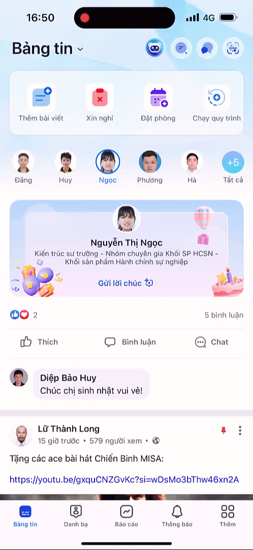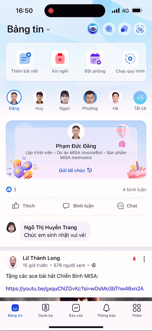 Tại đầu bảng tin, chương trình sẽ hiển thị danh sách nhân viên có sinh nhật hôm nay, anh/chị có thể nhấn để xem toàn bộ danh sách sinh nhật.