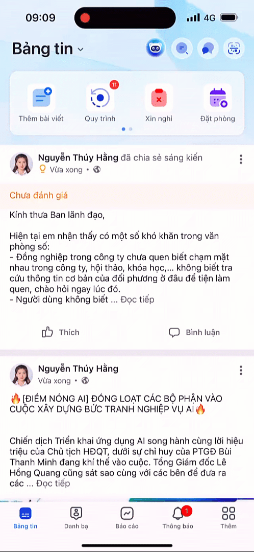 Sau khi gửi, sáng kiến sẽ được thêm vào phân hệ sáng kiến và hiển thị trên bảng tin, BLĐ sẽ xem xét và đánh giá tính khả thi và thực hiện đánh giá sáng kiến.