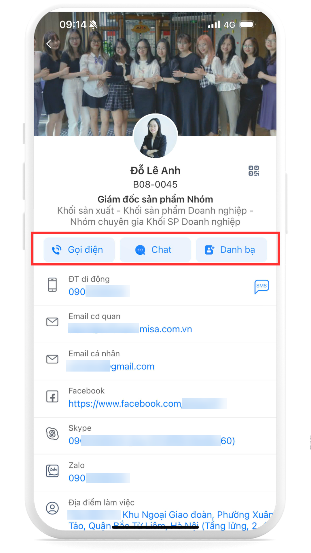 Phân hệ Danh bạ trên MISA AMIS Mobile giúp người dùng dễ dàng tra cứu, xem thông tin liên hệ của đồng nghiệp.