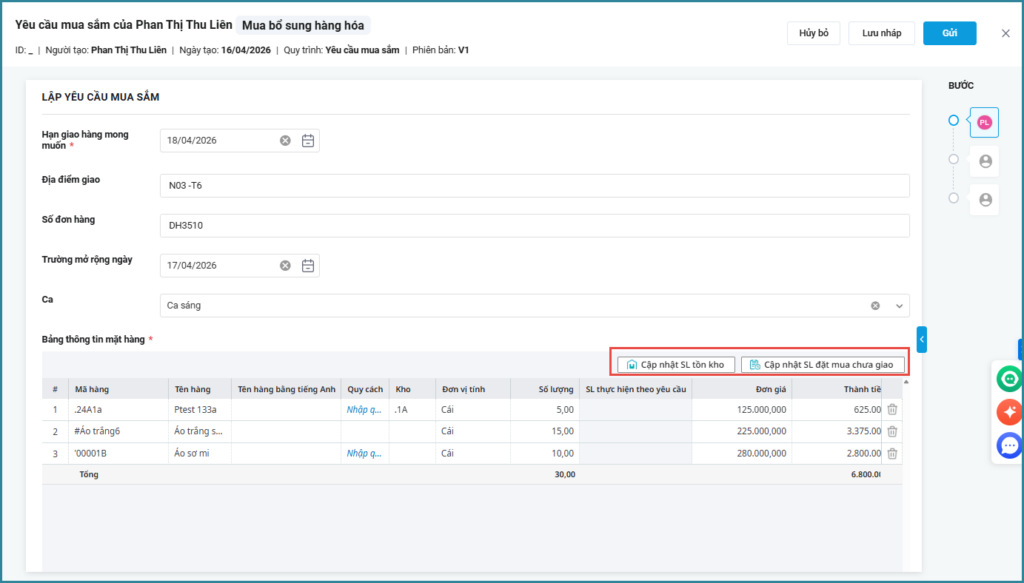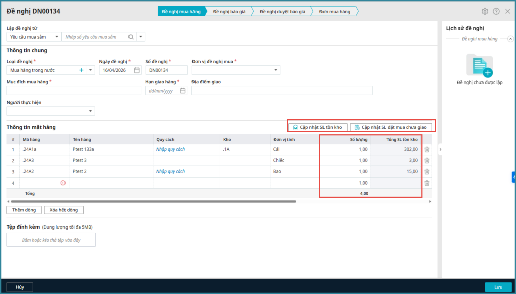 Bài viết hướng dẫn tính năng cập nhật SL tồn kho và SL đặt mua chưa giao, giúp bổ sung thông tin thực tế, hỗ trợ dễ dàng xem xét và phê duyệt, yêu cầu mua sắm, đề nghị mua hàng dễ dàng.